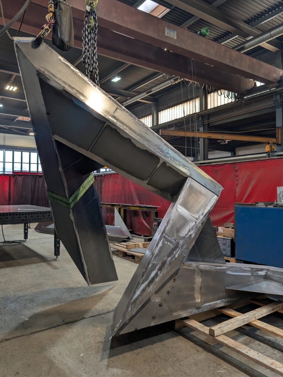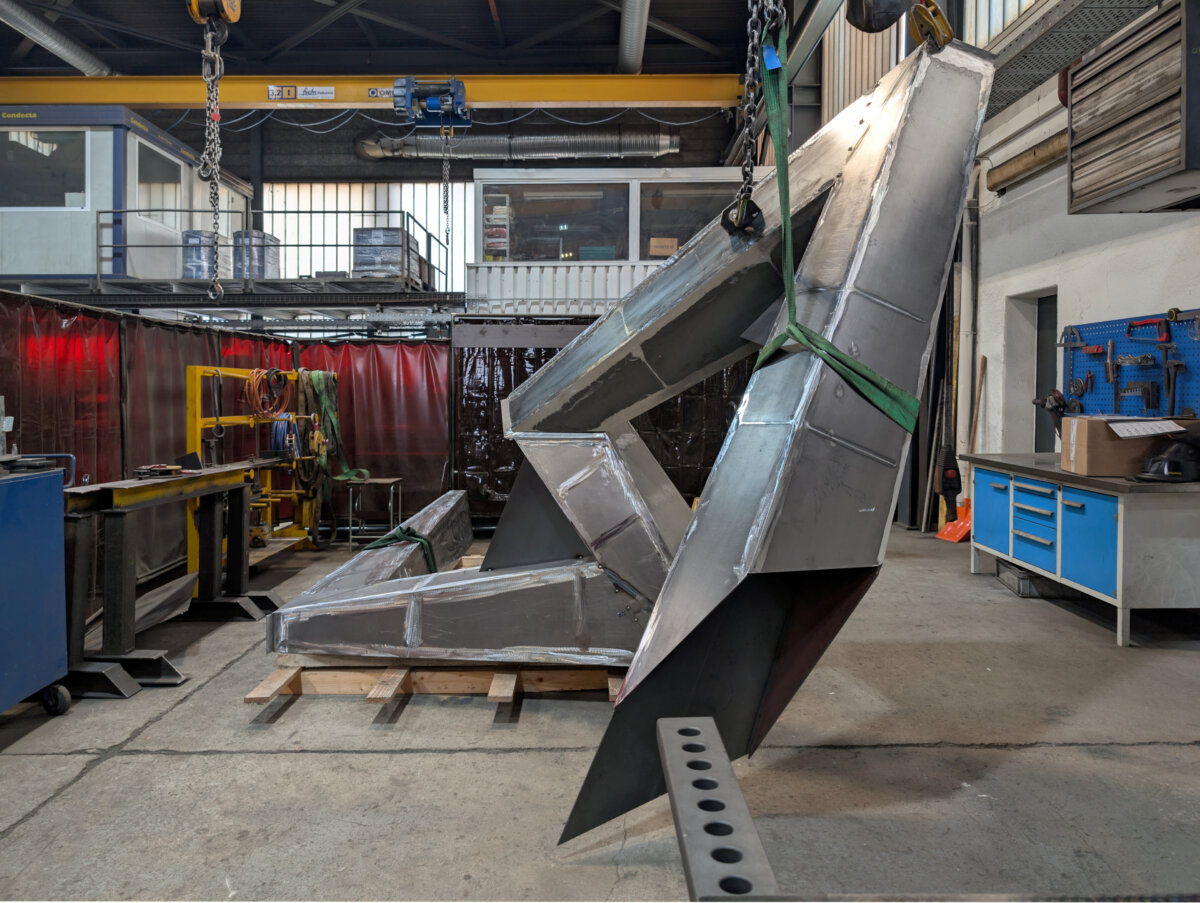 Foto 3: Beat Zoderer, Zack: Stahlbau – Testaufbau des oberen Drittels der Skulptur. ©ROK, Silvan Oesterle